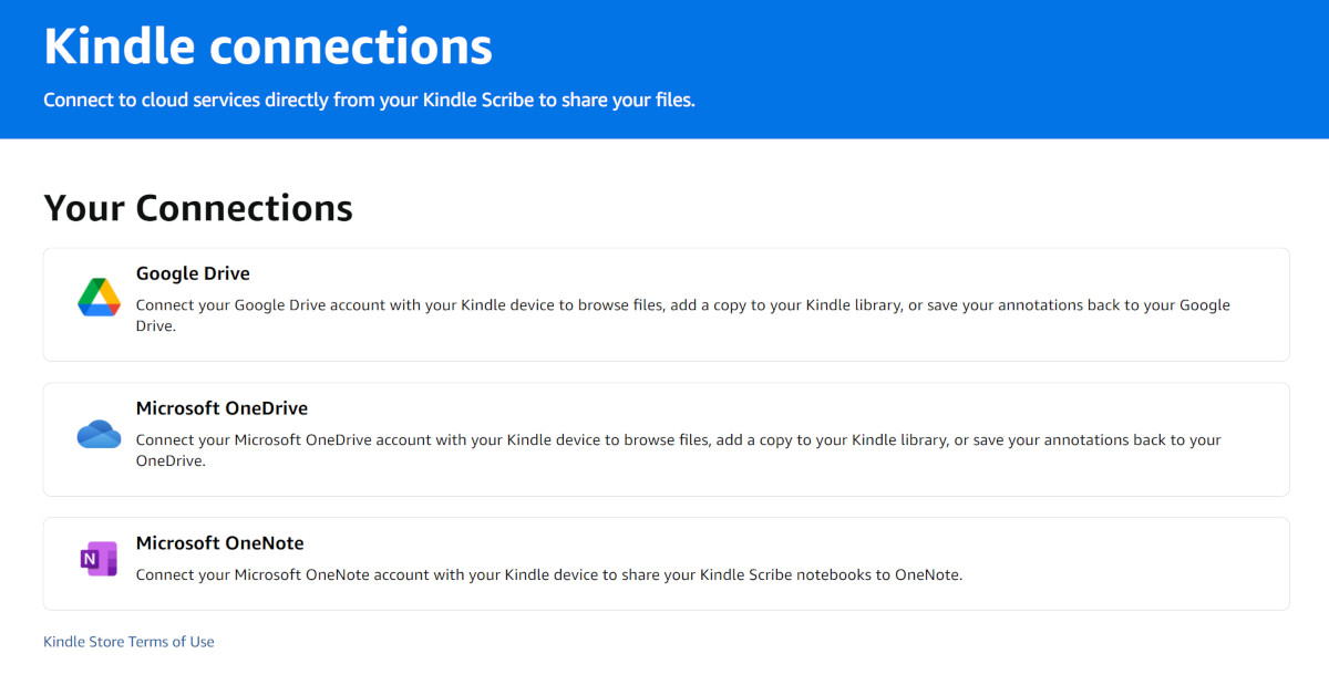 I was looking over the new Kindle Connections page at Amazon with user guides and FAQs about connecting the new Kindle Scribes to 3rd-party services like Google Drive and Microsoft OneDrive, and it raises more questions than it gives answers.