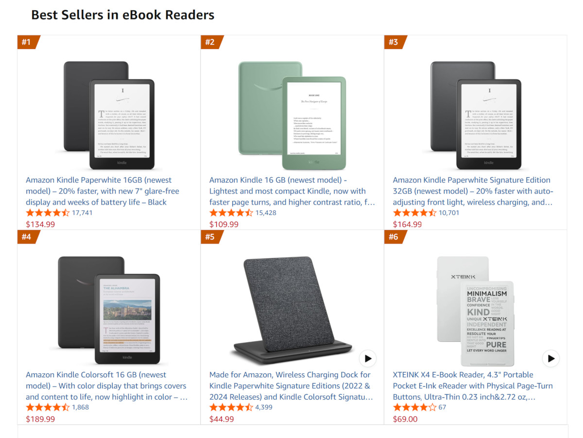 It’s currently ranked at #6, but it’s actually the 5th ranked ebook reader since #5 is a wireless charging dock for the Kindle Paperwhite and Colorsoft. That’s as high as any non-Kindle could expect to rank, and it’s the highest non-Kindle on the list. The next non-Kindle doesn’t appear until #14 (if you disregard the hardcover book that inexplicably appears at #9).